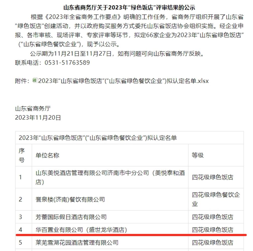 近日,山東省商務(wù)廳批準(zhǔn)華百置業(yè)盛世龍華酒店山東省四花級(jí)綠色飯店稱號(hào),這是濟(jì)陽(yáng)區(qū)首個(gè)申報(bào)并評(píng)審?fù)ㄟ^(guò)的省級(jí)綠色飯店,全省僅14家飯店獲此榮譽(yù)。