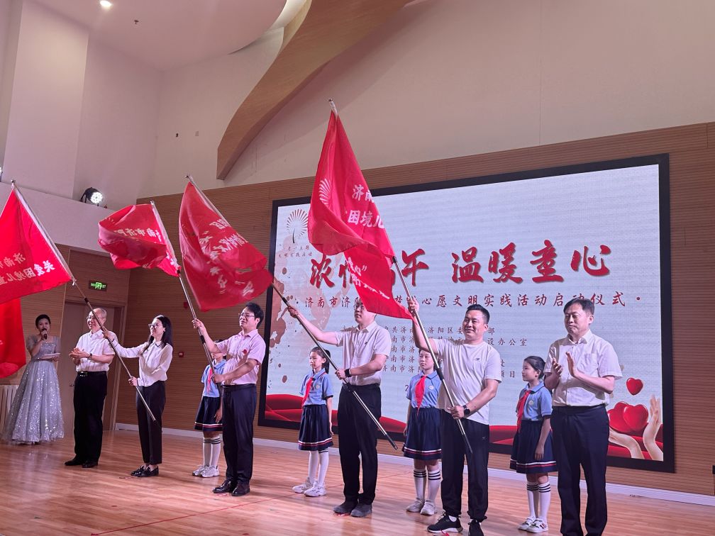 市委宣傳部副部長李英濤,區(qū)委常委、宣傳部部長鄧洪剛為四支孤困兒童幫扶隊(duì)伍授文明實(shí)踐服務(wù)隊(duì)旗幟。長田實(shí)業(yè)副總經(jīng)理成峻志上臺(tái)接旗。