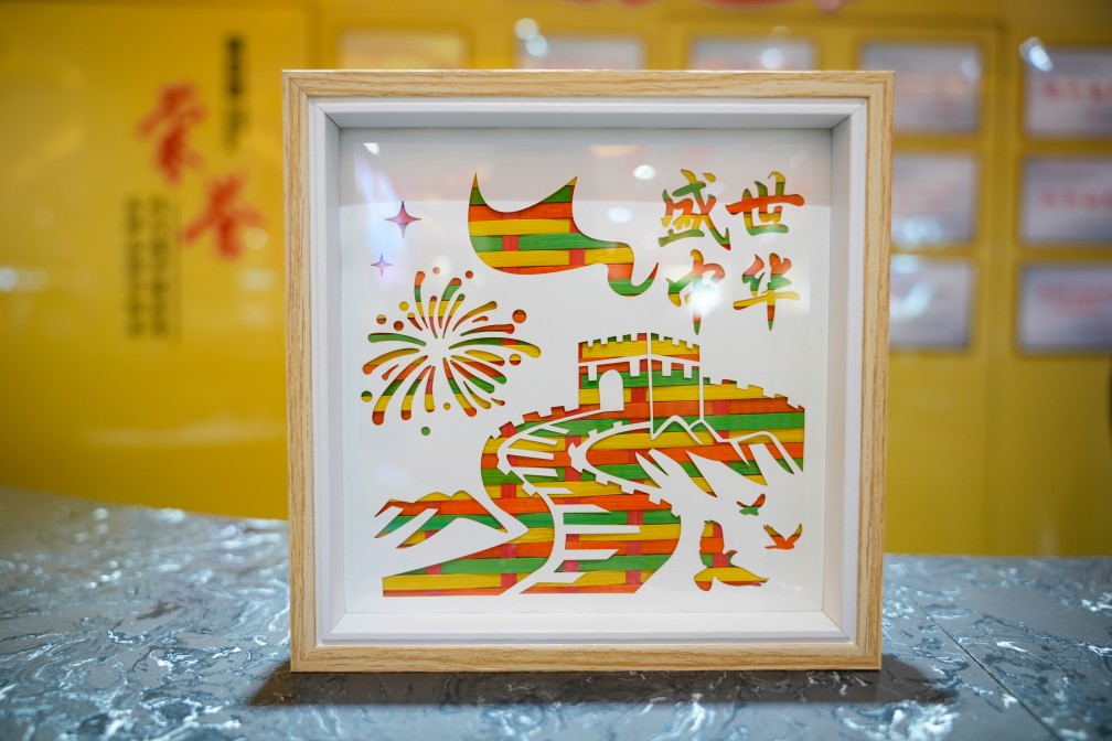 一穿一引,一挑一壓,這不僅是竹編的技巧,更是文化的傳遞。工作人員給孩子們分發(fā)相框、竹片、膠帶等制作用具,為孩子們講解非遺竹編畫(huà)的制作步驟,并親自示范帶領(lǐng)孩子們逐步制作。大家認(rèn)真地壓、挑、穿、引,每一個(gè)動(dòng)作都顯得那么專注而投入。陽(yáng)光透過(guò)玻璃,灑落在孩子們稚嫩而專注的面龐上,為這場(chǎng)景增添了幾分溫馨與美好,宛如一幅動(dòng)人的生活畫(huà)卷,記錄著他們對(duì)傳統(tǒng)文化的熱愛(ài)與傳承。