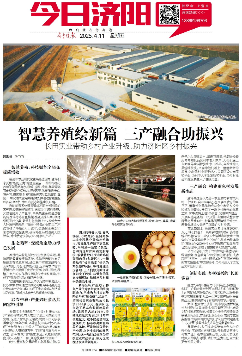 2024年,四月的齊魯大地,春風(fēng)拂面,萬物競發(fā)。在濟南易豐農(nóng)業(yè)現(xiàn)代化蛋雞養(yǎng)殖場內(nèi),智能化生產(chǎn)線正高效運轉(zhuǎn),呈現(xiàn)出一派繁忙景象。自動傳送帶如同銀龍般穿梭,承載著數(shù)以萬計的雞蛋奔涌向前;包裝區(qū)內(nèi),一箱箱貼有“長田樂享”標(biāo)識的雞蛋整齊列隊,等待發(fā)往全國各地。工人們額角的汗珠在陽光下閃爍,與嘴角的笑意交相輝映,映射出鄉(xiāng)村振興的蓬勃生機。