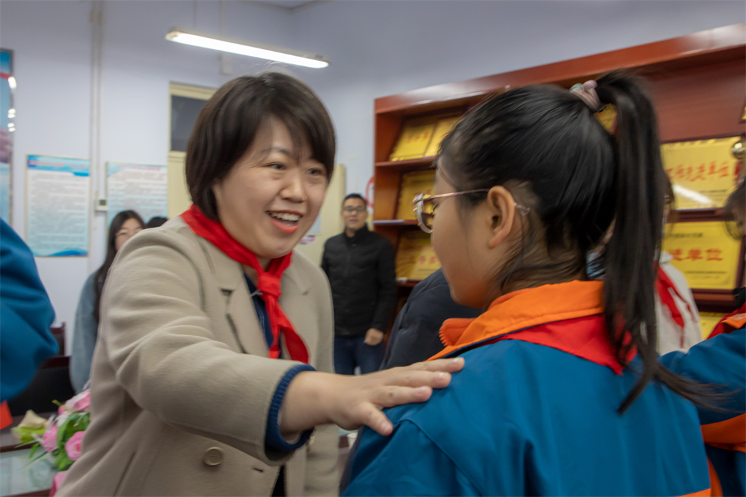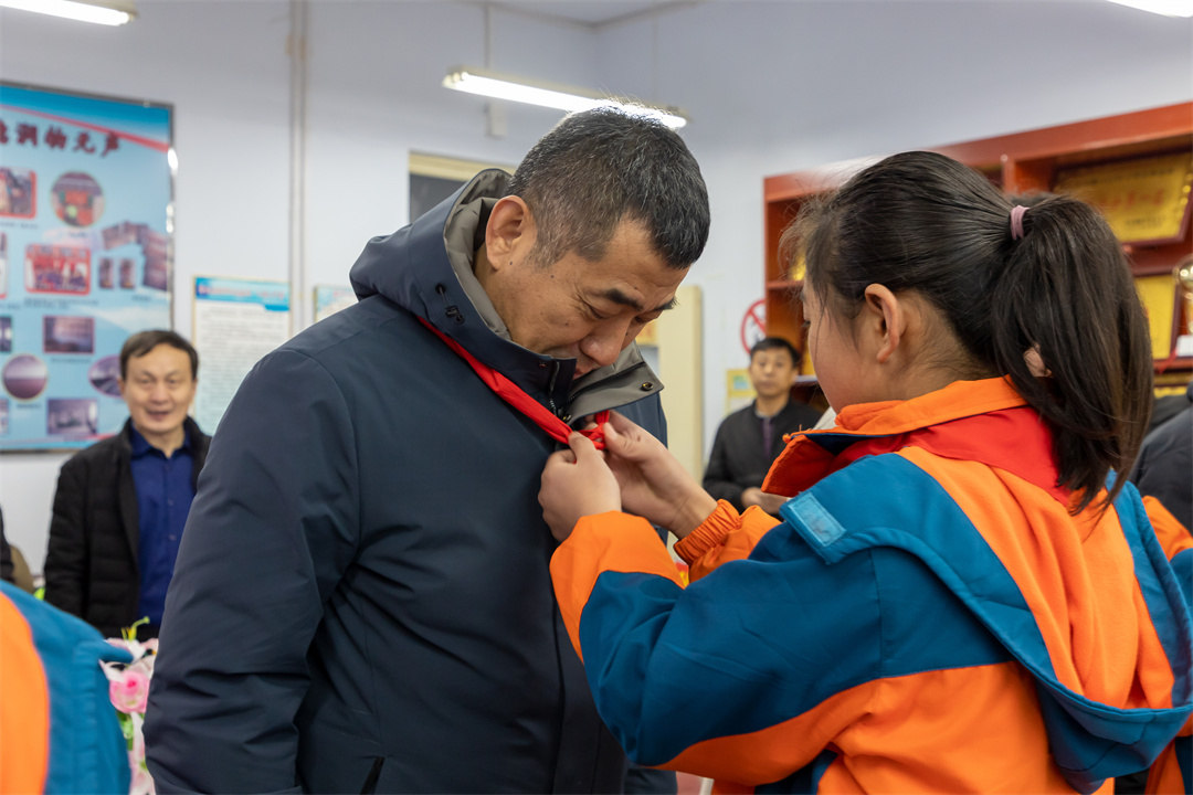 孩子們?yōu)閳F區(qū)委書記王璐、董事長張勇佩戴紅領巾。