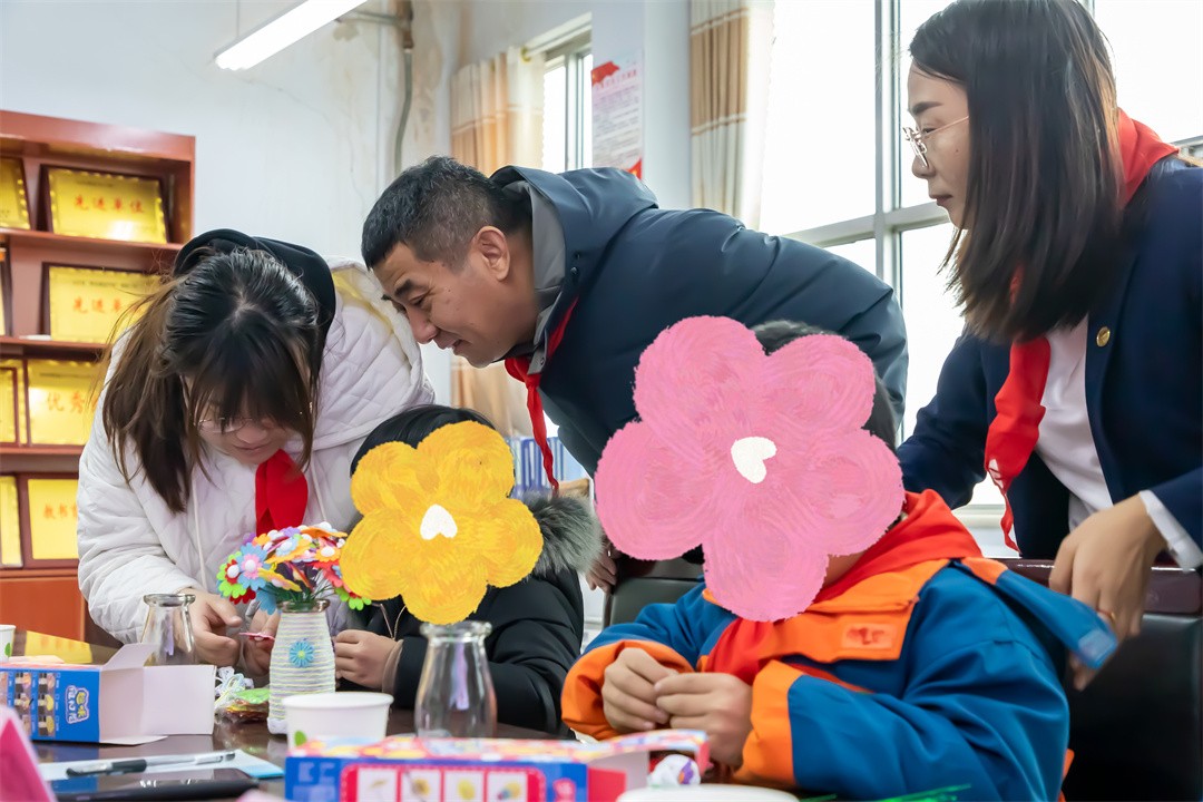 大家和孩子們談心交流,一起制作手工。送你一朵小紅花 ,多么苦難的日子,你都戰(zhàn)勝了它;獎勵你有勇氣,做生活的探險家!